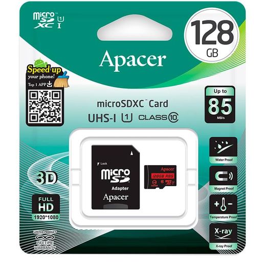 Карта памяти MicroSD 128GB Apacer, UHS-I 85MB/s, Class 10 + SD Adapter (AP128GMCSX10U5-R)